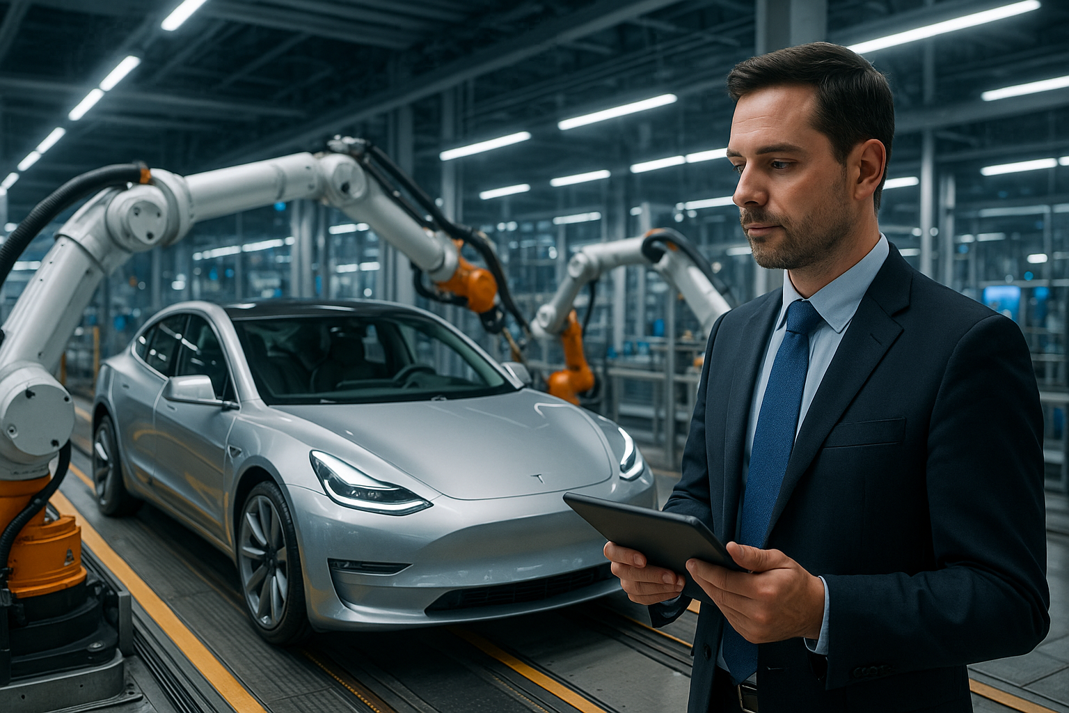 テスラは車両生産の中核を担う工場で、作業効率を最大化するための自動化・光学センサー・制御技術を積極的に導入している。